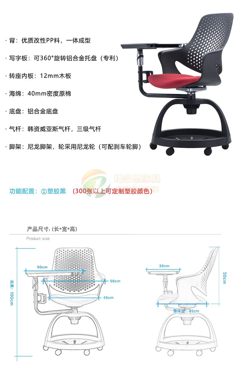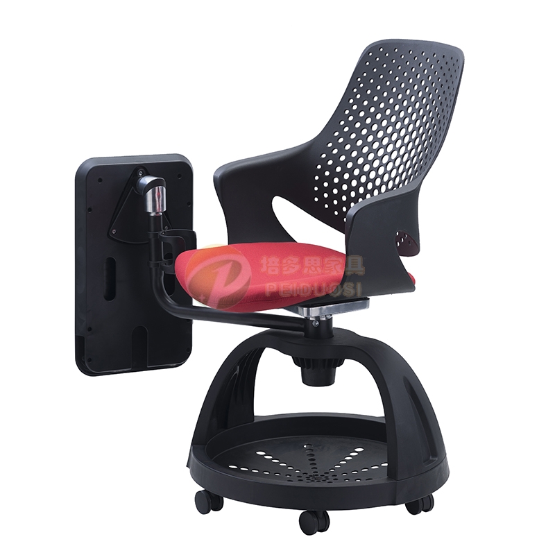 2、個(gè)人化工作桌面,尼龍塑料寫字板,開放式杯架,開放式的座位設(shè)計(jì),提供便捷的帶掛包功能扶手,寫字板可360度旋轉(zhuǎn),方便左右前后工作。